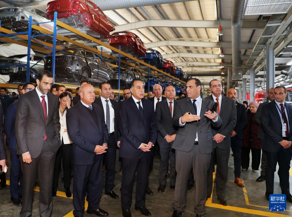 1月15日,在埃及吉萨省的十月六日城,埃及总理马德布利(前右)参观吉利汽车埃及工厂生产线。