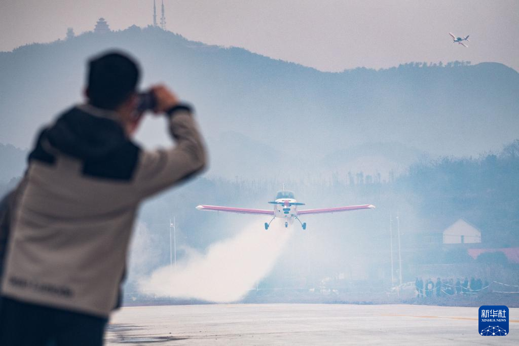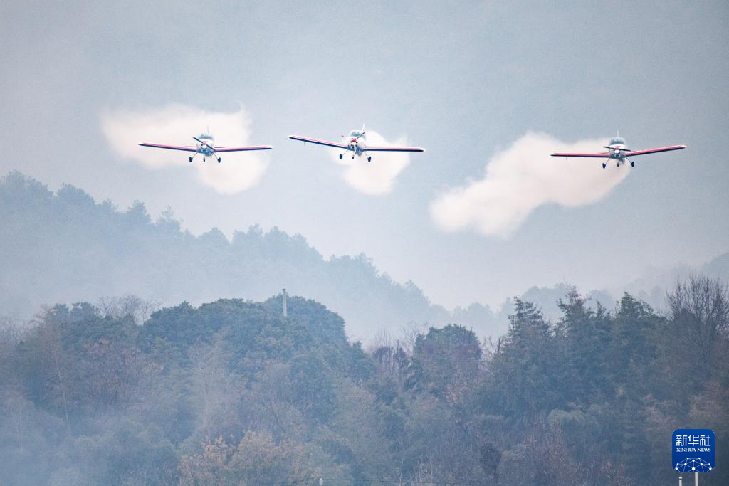 1月18日,在柳叶湖龙翔低空飞行营地,飞行员进行固定翼编队飞行表演。