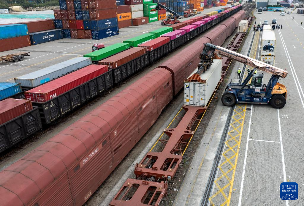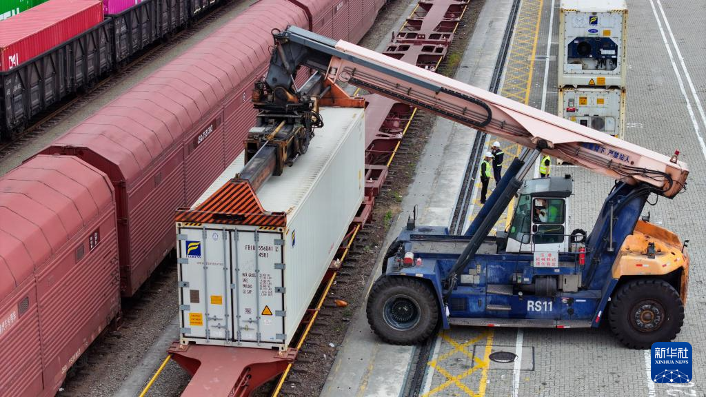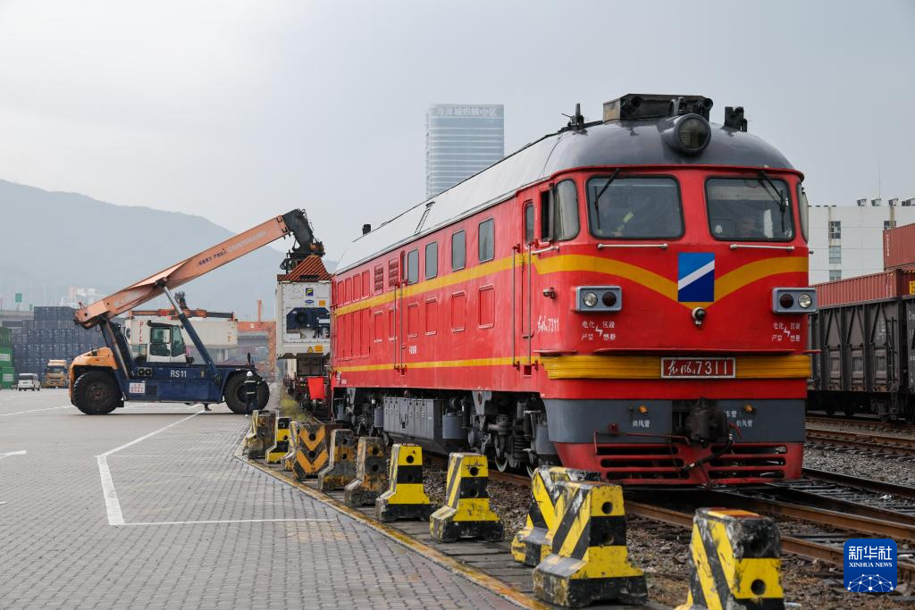 1月22日,在深圳盐田港,载有巴西冻果汁的冷柜被搬运到深圳盐田直达江西赣州的铁海联运冷链班列上。