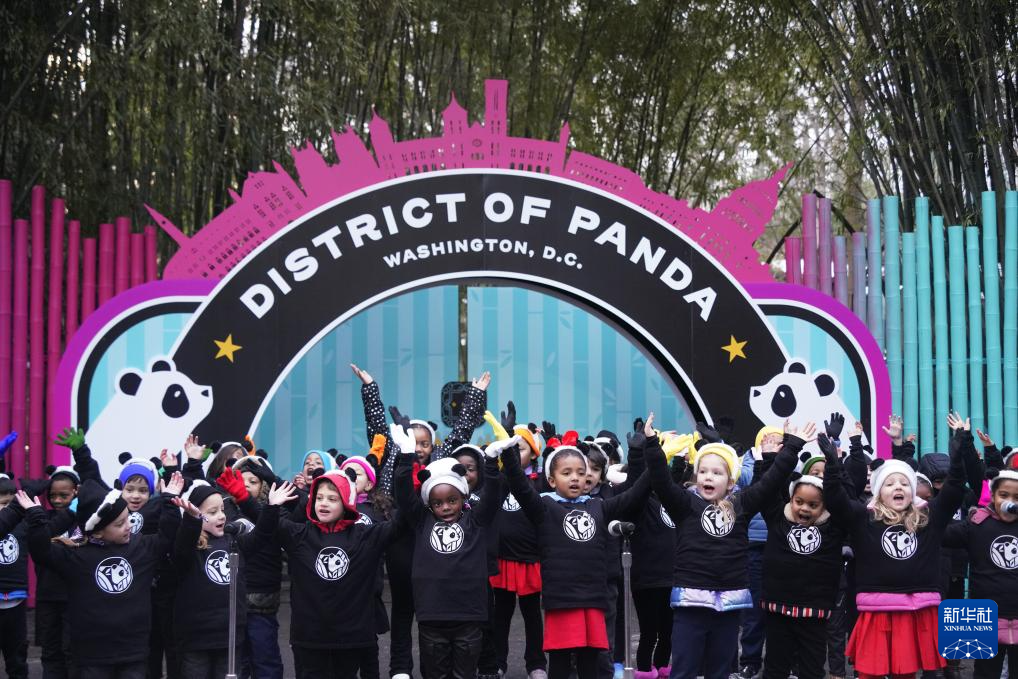 1月24日,在美国首都华盛顿的史密森学会国家动物园,孩子们在大熊猫馆开馆仪式上表演。