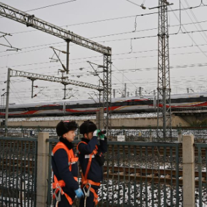 1月26日,天津供电段供电维修车间职工在铁道沿线巡视。