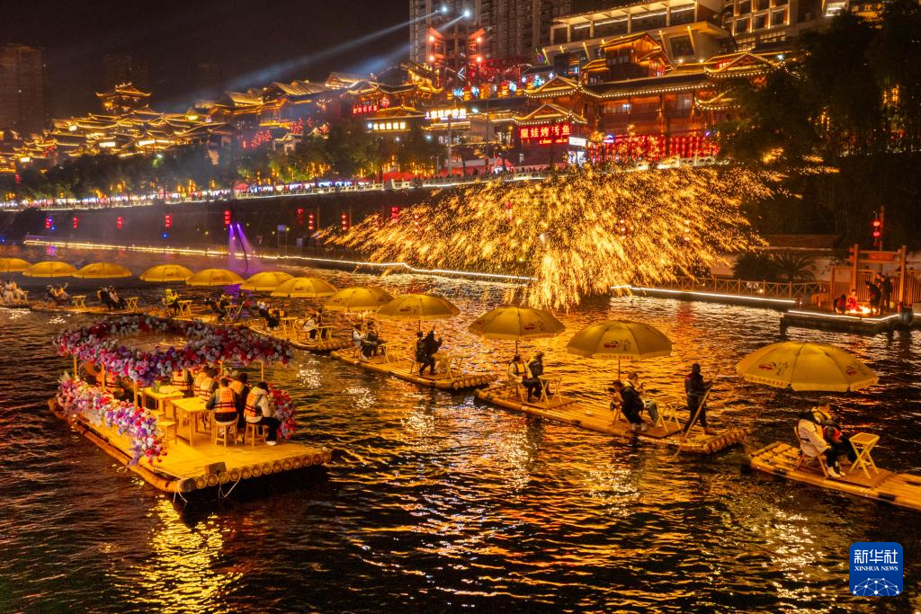1月26日,人们在湖北省恩施土家族苗族自治州宣恩县城观看打铁花表演(无人机照片)。