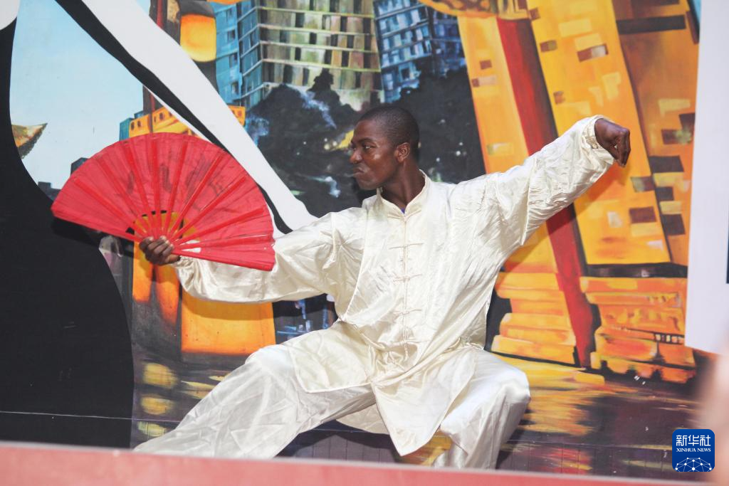 1月25日,在贝宁科托努的贝宁中国文化中心,一名武术爱好者在春节联欢晚会上表演。