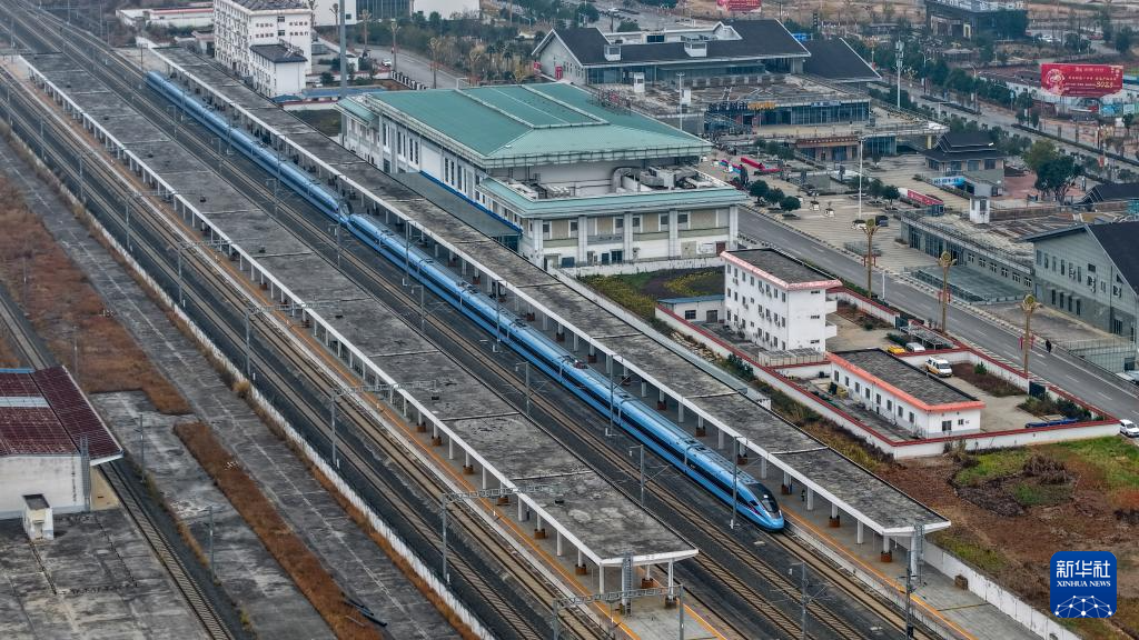 2月5日,务工专列D3832次列车驶出广南县站(无人机照片)。