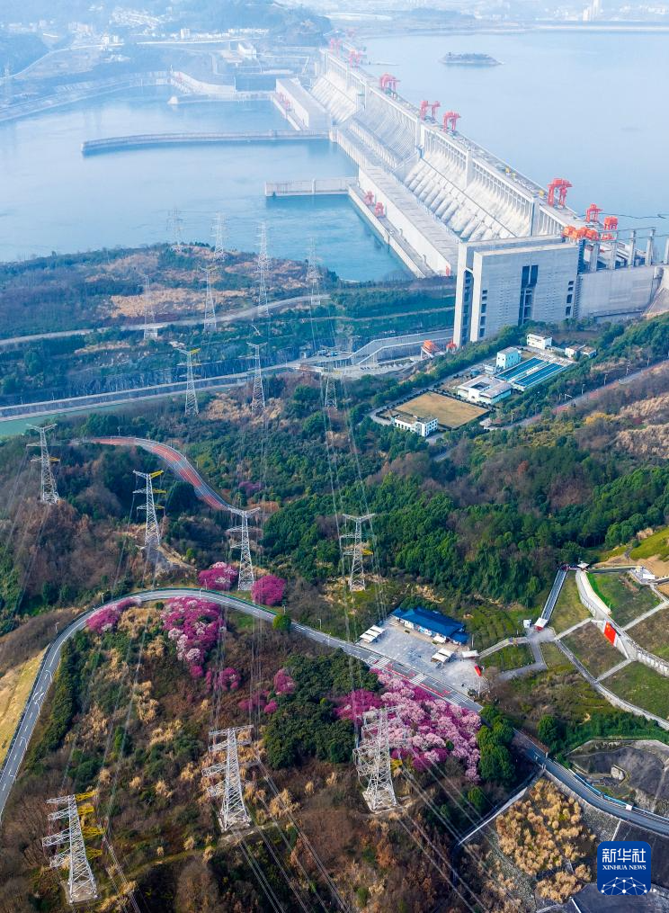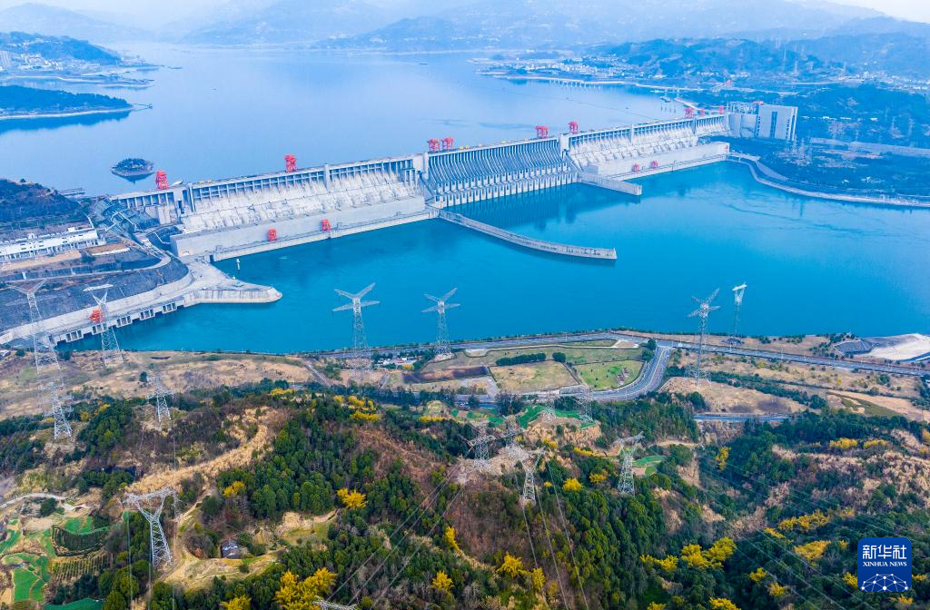 2月7日在湖北宜昌拍摄的三峡大坝和外送输电线路(无人机照片)。