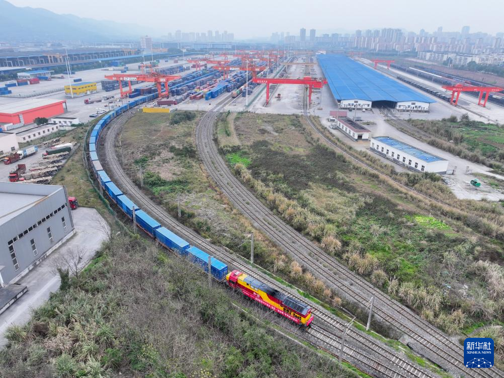 2月10日,中亚班列在重庆团结村车站顺利发车(无人机照片)。