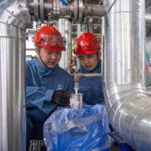 2月11日,在重庆市长寿区的中国石化川维化工VAE(醋酸乙烯-乙烯共聚乳液)项目,工作人员在转运产品。