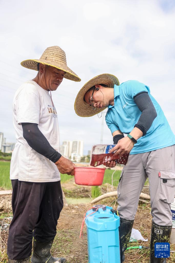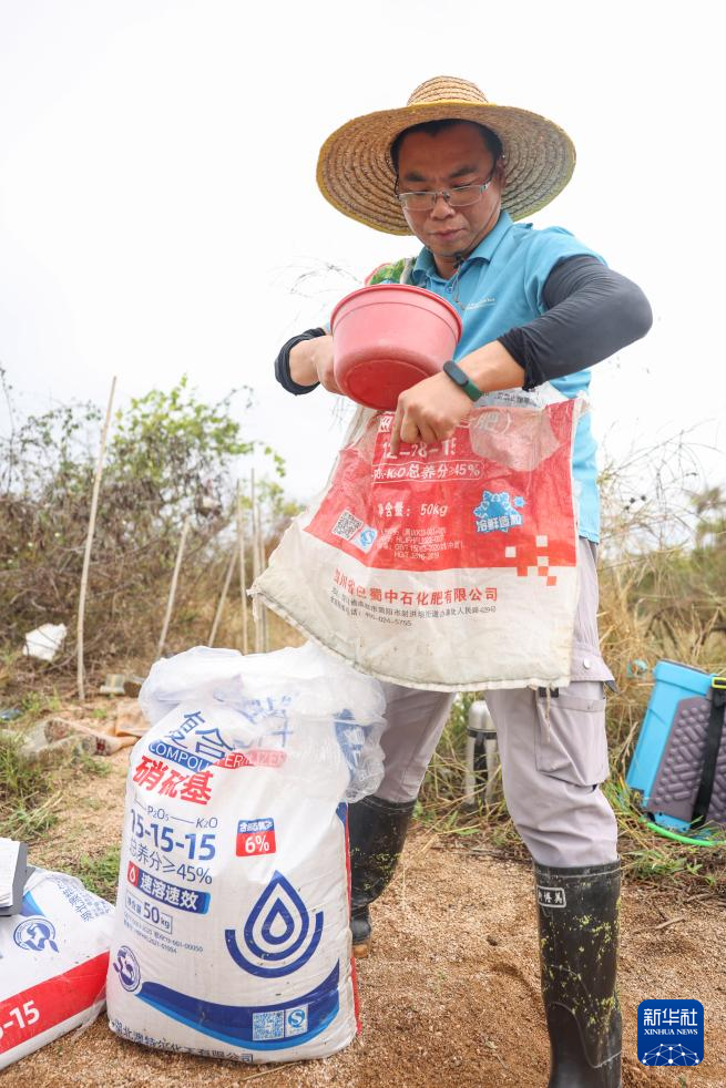 2月14日,在海南三亚的国家南繁科研育种基地里,青岛海水稻研究发展中心的科研人员张书艮做施肥前的准备工作。