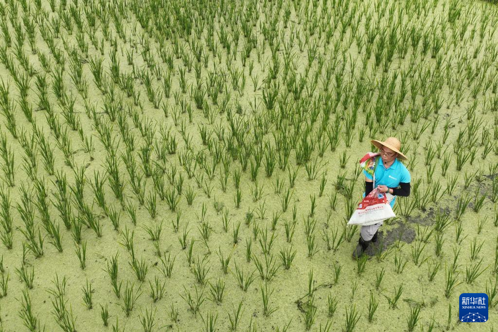 2月14日,在海南三亚的国家南繁科研育种基地里,青岛海水稻研究发展中心的科研人员张书艮对水稻进行施肥(无人机照片)。