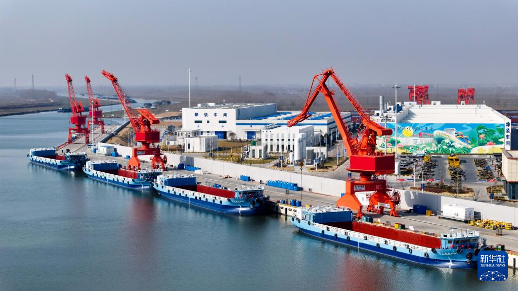 2月16日,在济宁能源集团山东新能船业有限公司,新能源船舶在进行舾装作业(无人机照片)。