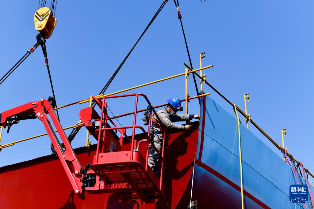 2月16日,在济宁能源集团山东新能船业有限公司,工作人员在船体搭载平台对新能源船舶进行组装作业。