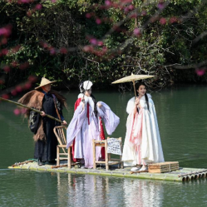 2月18日,汉服爱好者在西溪湿地乘坐竹筏赏梅。