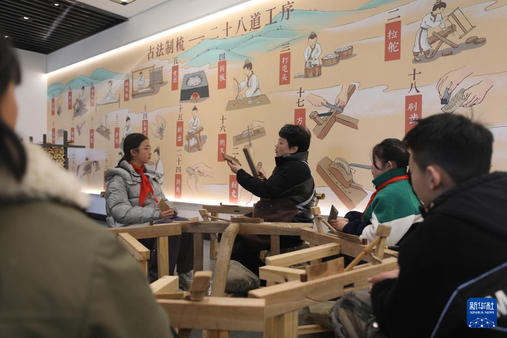 2月18日,在榔桥镇梳乡文化园,手工艺人为前来研学的学生展示“柿柿如意”手工木梳。