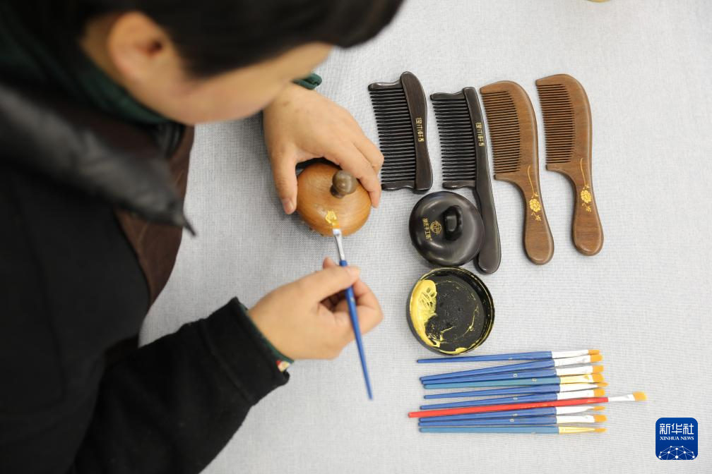 2月18日,在榔桥镇梳乡文化园,手工艺人给木梳描金。