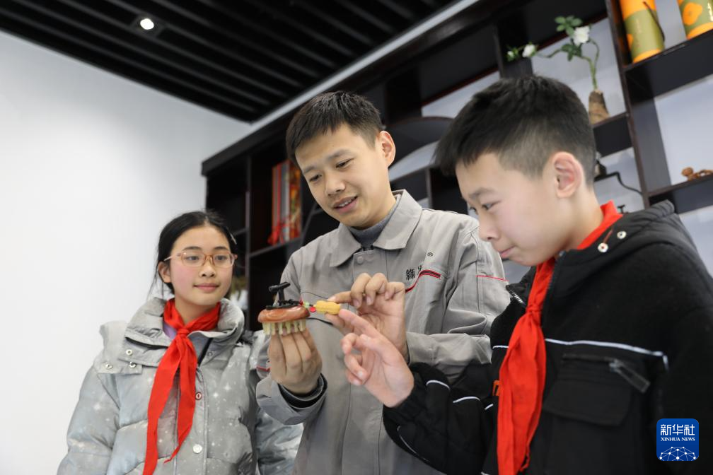 2月18日,在榔桥镇梳乡文化园,榔桥木梳制作艺人胡桂荣为前来研学的学生讲解木梳制作技艺。