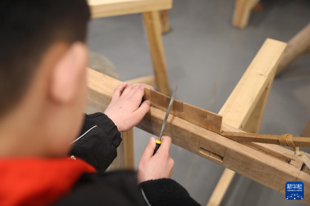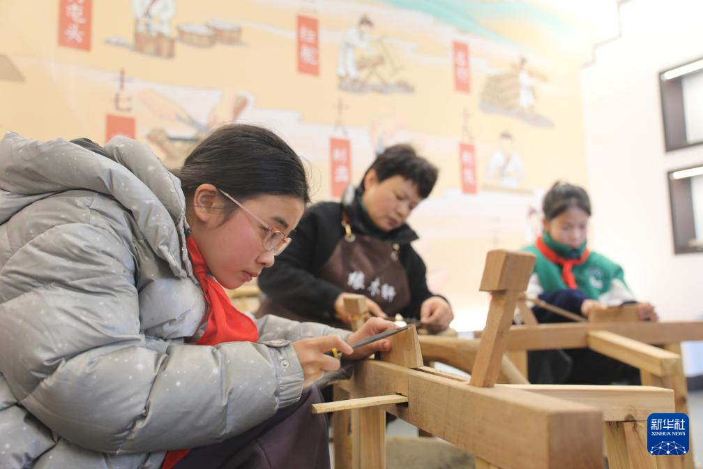 2月18日,在榔桥镇梳乡文化园,研学的学生体验木梳制作。