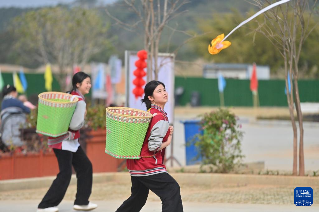 2月20日,在梧州市长洲区倒水镇富万村金桂广场,富万小学的学生参加抛绣球比赛。