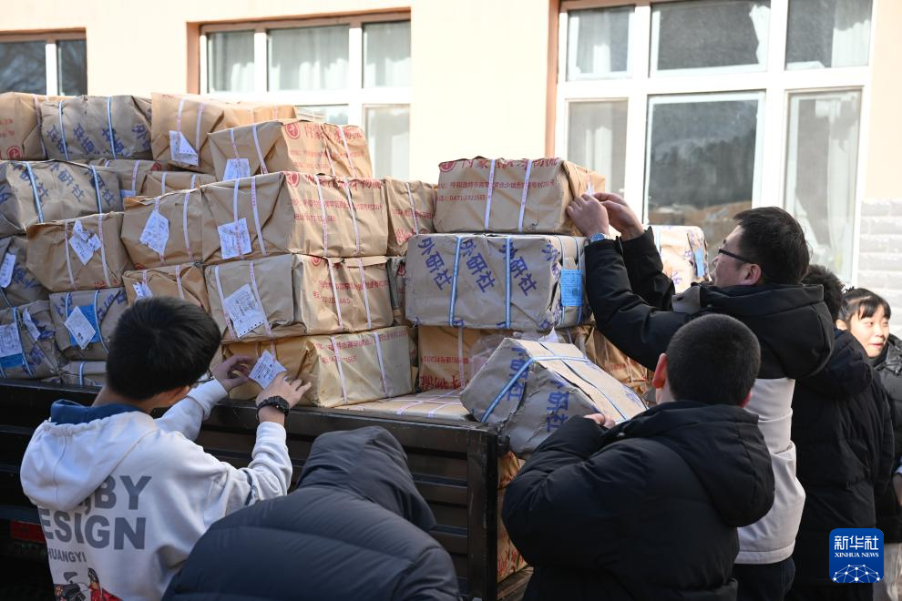 2月21日,师生在内蒙古兴安盟乌兰浩特市第十二中学搬运教材。