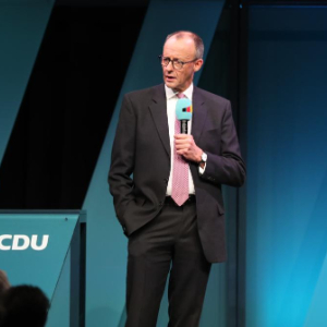 2月18日,在德国波茨坦,德国联盟党总理候选人默茨在竞选集会上讲话。