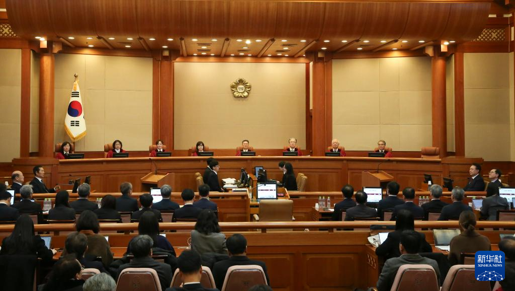 这是2月20日在韩国首尔宪法法院拍摄的总统弹劾案庭审现场。