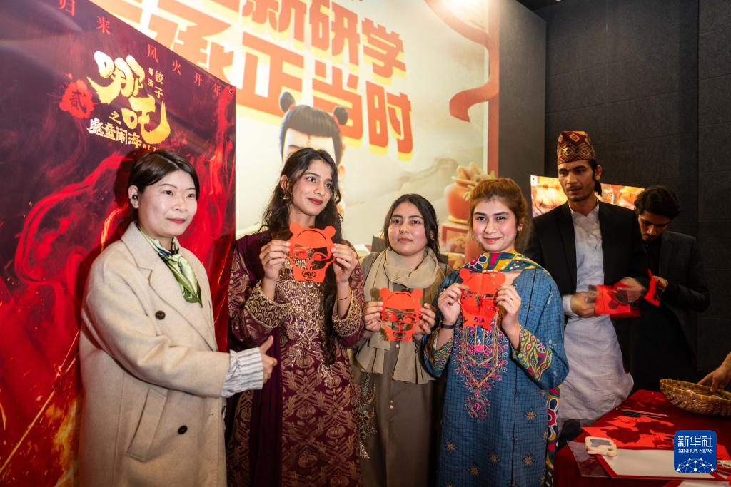 2月25日,在长沙摩天轮国际影城,留学生们和志愿者(左一)在展示“哪吒”剪纸作品。