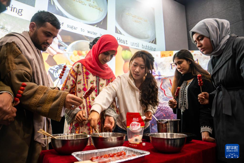 2月25日,在长沙摩天轮国际影城,留学生们在志愿者(右三)的指导下制作冰糖葫芦。