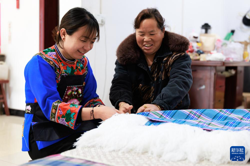 在镇宁布依族苗族自治县六马镇致富村,卢丹(左)和村民卢成敏一起编织民族特色布匹(2025年2月20日摄)。