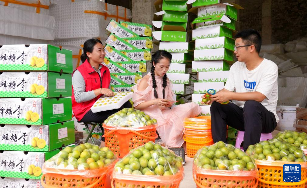 在镇宁布依族苗族自治县六马镇致富村,卢丹(左)和村民一起包装蜂糖李(2024年6月26日摄)。