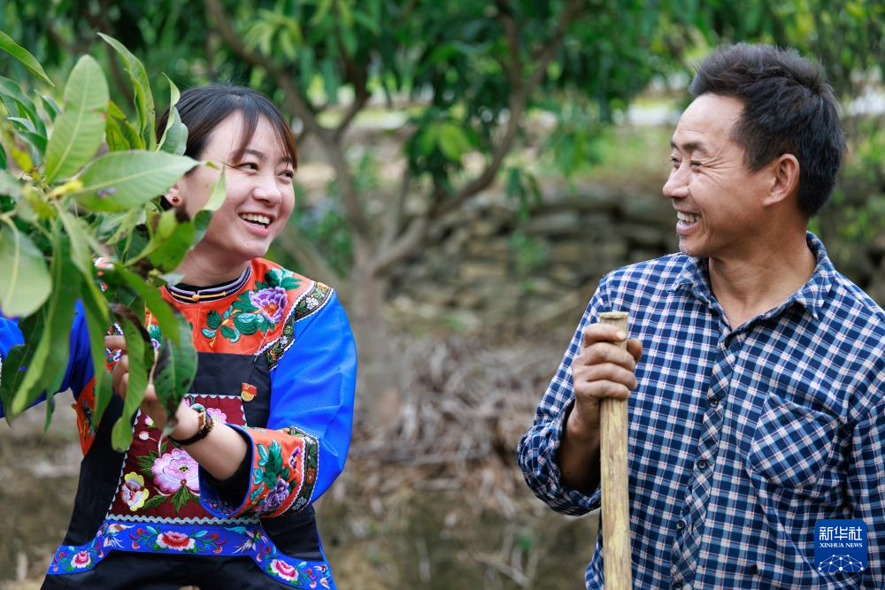 在镇宁布依族苗族自治县六马镇致富村,卢丹(左)与村民刘发志交流芒果种植情况(2025年2月20日摄)。