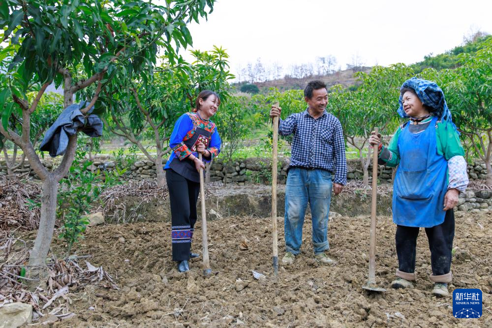 卢丹(左)在镇宁布依族苗族自治县六马镇致富村与村民交流果树种植情况(2025年2月20日摄)。