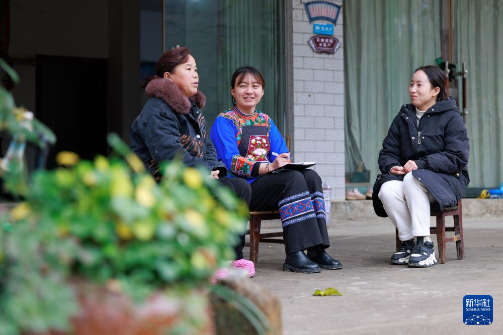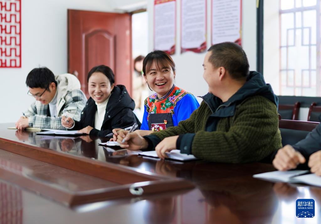 卢丹(右二)在镇宁布依族苗族自治县六马镇致富村村委会和同事交流工作(2025年2月20日摄)。