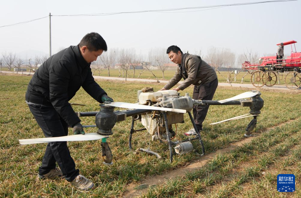 2月27日,植保无人机飞手陈波在山东省新泰市禹村镇检查无人机桨叶。