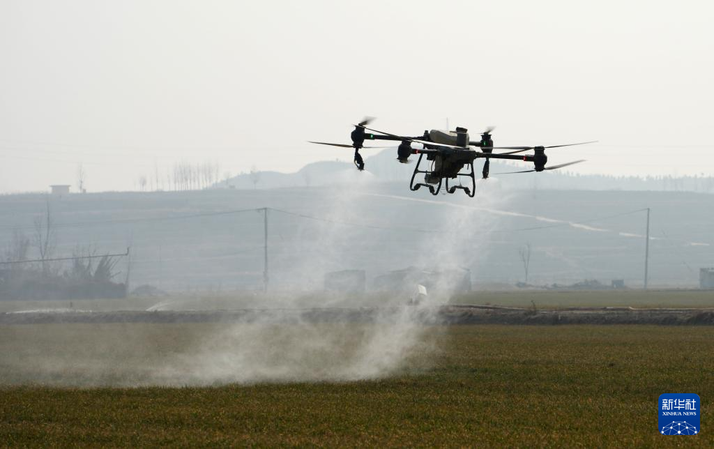 近日,山东泰安新泰市天气转暖,小麦进入返青期,当地植保无人机飞手忙着在麦田开展无人机杂草防治、肥料喷施等作业。近年来,新泰市大力发展无人机植保服务,目前全市有持证植保无人机飞手100余名,可服务农田面积超过30万亩。