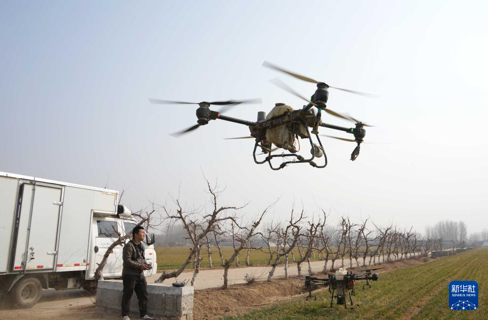 2月27日,植保无人机在山东省新泰市禹村镇作业。