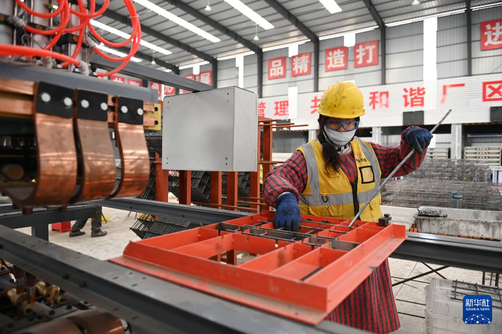 2月28日,在中铁二十二局西安东站小型预制构件智能化生产流水车间,施工人员加工预制构件。