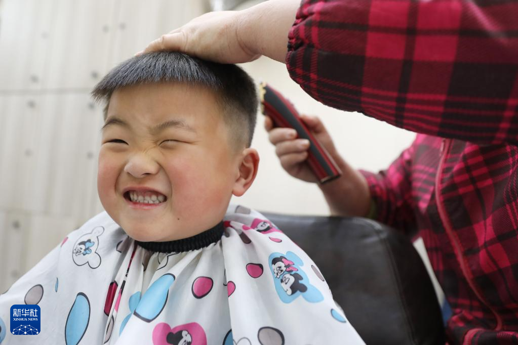 3月1日,一名小朋友在河南省焦作市温县一家理发店理发。