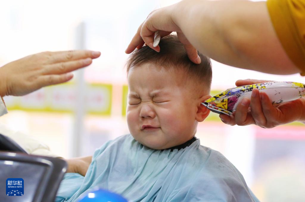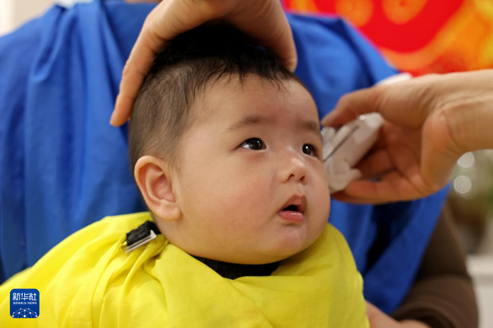 3月1日,小朋友在山东省滨州市一家理发店理发。