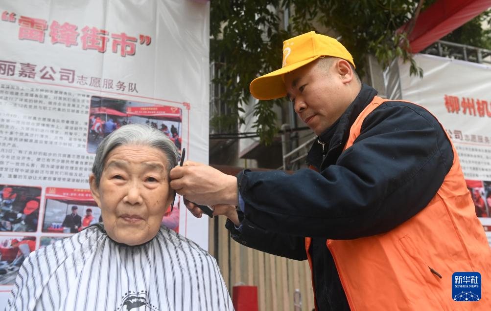 3月5日,在广西柳州市革新路“雷锋街市”,志愿者在为市民理发。