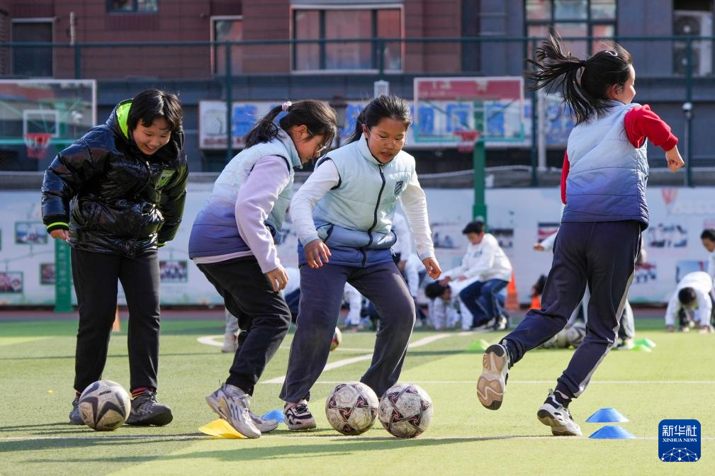 在北京市宣武师范学校附属第一小学,学生在体育课上踢足球(2月21日摄)。