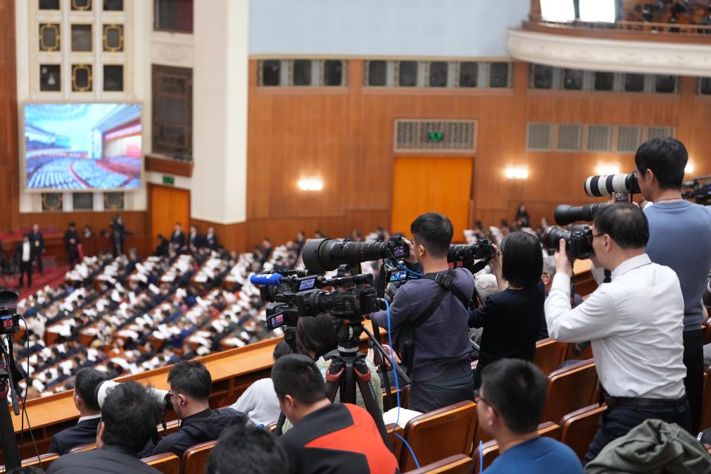 3月8日,十四届全国人大三次会议在北京人民大会堂举行第二次全体会议。这是记者在会场采访。