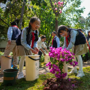 3月11日,在云南省昆明市盘龙区长青社区,几名小学生为刚种的三角梅浇水。