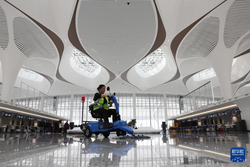 3月11日,保洁人员在兰州中川国际机场T3航站楼出发大厅进行保洁工作。