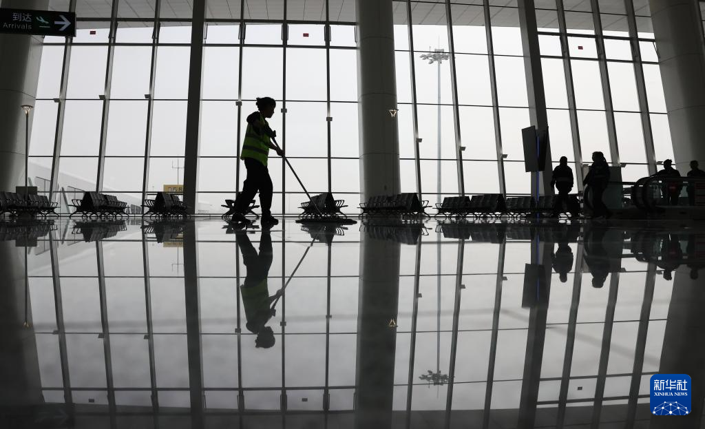 3月11日,保洁人员在兰州中川国际机场T3航站楼候机区域进行保洁工作。
