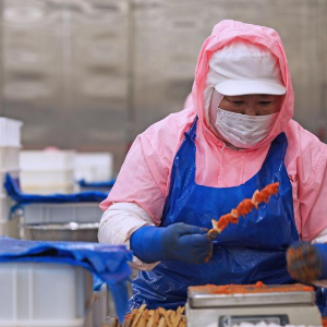 3月11日,在鞍山丰盛食品有限公司,工人在车间加工处理鸡肉串。