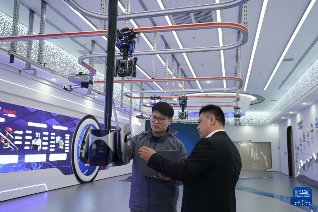 在雄安新区科创中心中试基地,北京普龙科技有限公司工作人员在调试巡检机器人(2月26日摄)。