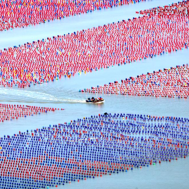 3月18日,福建省宁德市霞浦县三沙镇海域的海洋牧场,养殖工人在进行养殖作业。