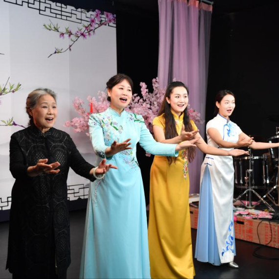 3月19日,“50后”的常德丝弦名家宋洁(左一)、“60后”的常德丝弦代表性传承人朱晓玲(左二)、“80后”的常德丝弦青年传承人伍恩禹(右二)与“90后”青年演员代表谢颜竹(右一)四代曲艺人共同排练曲目。