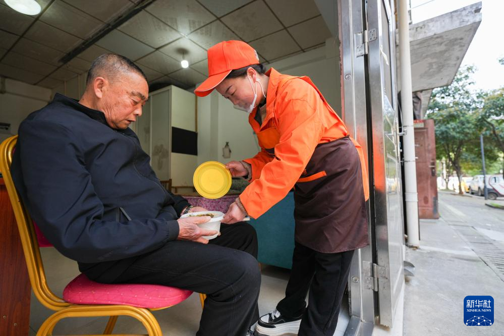 3月19日,在湘潭市雨湖区和平街道杉山社区,社区食堂的工作人员将午餐送到一名腿脚不便的老人家中。