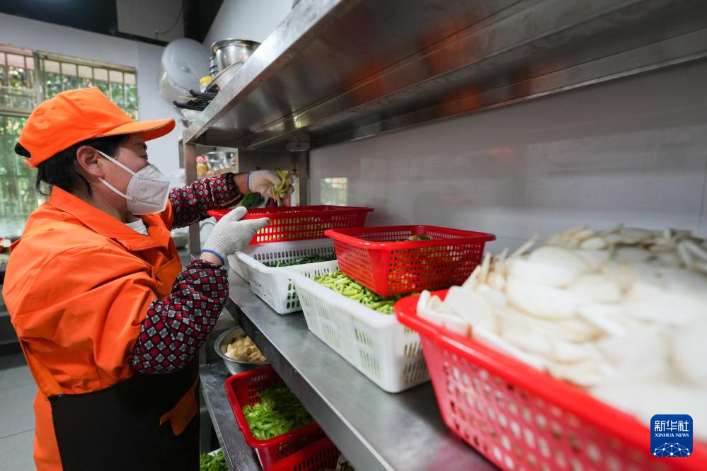 3月19日,在湘潭市雨湖区和平街道杉山社区食堂,工作人员在添加餐品。