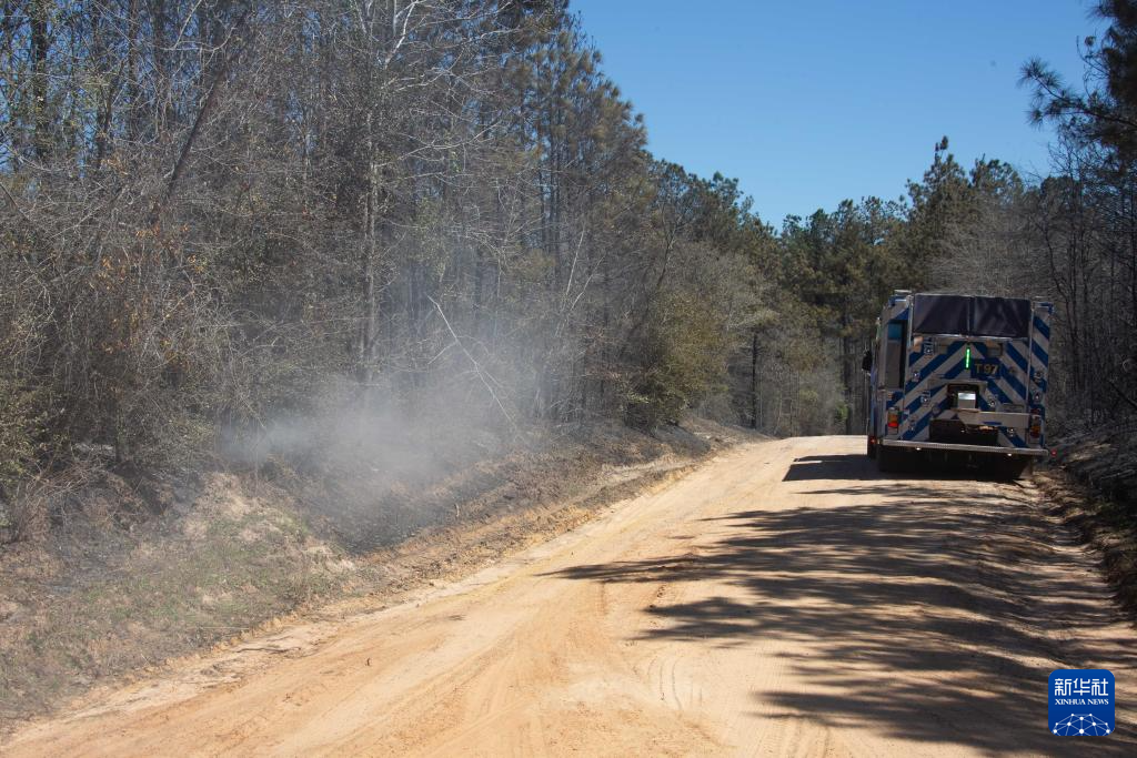 3月20日,在美国得克萨斯州山姆休斯敦国家森林公园,消防车在发生野火的区域作业。
